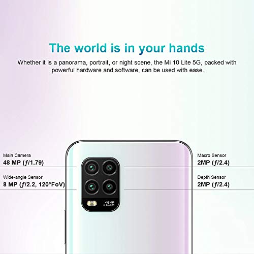 【Cámara cuádruple de 48 MP con IA】Xiaomi Mi 10 Lite con cámara principal de 48 MP + Sensor gran angular de 8 MP + Sensor macro de 2MP + Sensor de profundidad de 2MP.Ya sea una panorámica, un retrato o una escena nocturna, podrá utilizar fácilmente el Mi 10 Lite 5G, con un potente hardware y software integrados. La cuádruple cámara con IA puede gestionar cualquier escena.